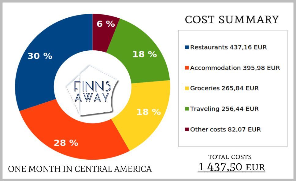 In this chapter we summarize all the costs of our one month trip, with a breakdown to different cost categories. Flight costs are not included, as they vary a lot depending on where you are coming from. We came to Central America overland from Chetumal in Yucatan Peninsula, Mexico, and after the tour flew from El Salvador to Mexico City. Our flight from San Salvador to Mexico City cost 122 € per person (roughly 137 USD), including luggage. November and early December are outside the high season, which begins before Christmas, so it was great time to travel. Especially in the popular tourist destinations, like island resorts for example, the prices can rise notably during the high season.