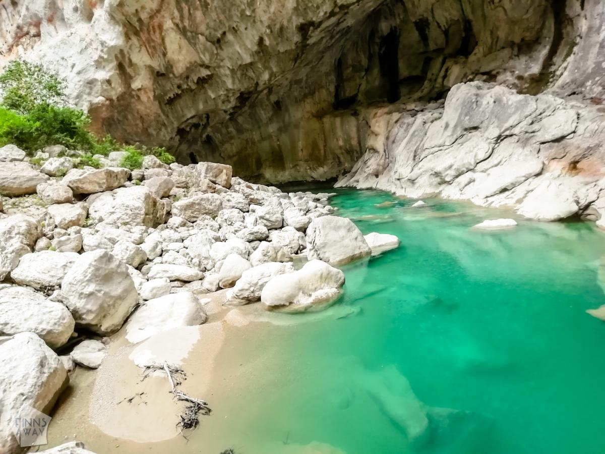 After walking roughly three kilometers from the bridge, the path climbs again higher to the woods, and reaches the crossroads with Sentier Vidal trail. This is where the climb back up begins, but it’s recommended to continue further downstream to reach the Imbut, where the canyon narrows and river disappears to an underpass. The path towards l’Imbut goes up and down, but is easy to follow. In about 20 minutes you’ll reach a pebbled beach and see how the walls get closer together. This looks like the trail end, but you can still continue bouldering over and around huge rocks, following white painted marks. It’s quite challenging at times to find your way, and might feel impossible if you have no experience on climbing. After 15 minutes or so, you’ll reach a beautiful beach called Baou Beni, where the trail ends.