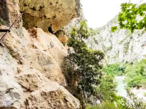 L’Imbut trail offers wonderful landscapes, as the path mostly follows the river very close to it. There is a section where the path dives in a humid forest, and at times it runs basically straight above the river, carved into the canyon wall. You will also walk past an impressive section of the river, where white, round limestone rock walls and basins form a narrow canyon inside the main canyon. This place is called Styx – based on Greek methodology the name means one of rivers leading to the underworld. Soon after the Styx, you’ll then hike higher again, and reach a ledge called Maugue, where the trail is carved into the rock wall. The path is only 70 cm wide and runs quite high above the river, but it is easy to walk and secured with handrails.