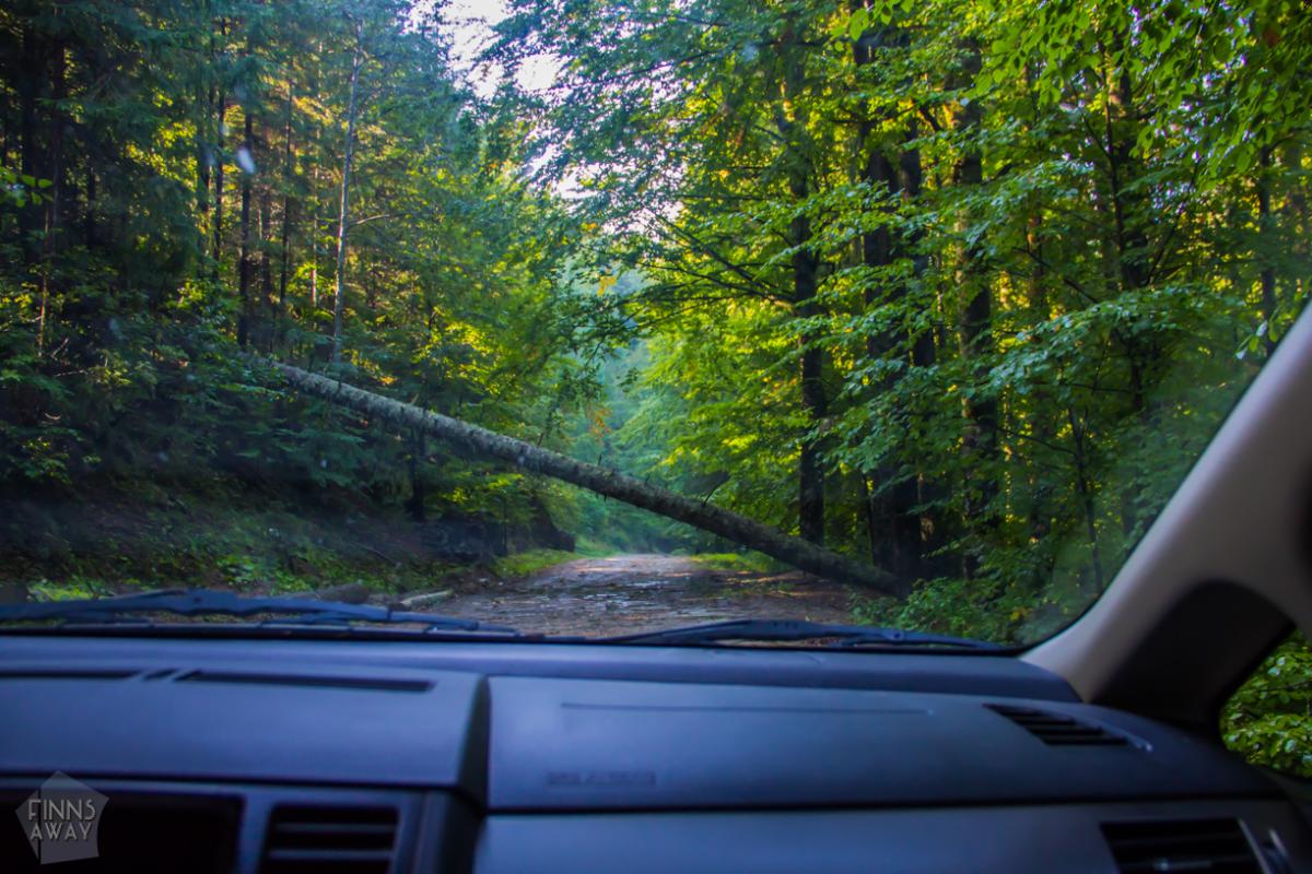 The next morning was again perfectly calm, with no sign of the storm. Or so we thought until continuing our way down the Transfagarasan road. There were several fallen trees over the dirt road to the cabana and over the power lines. Luckily somebody had already cleared the way so much that we could get past (or under) the trees. The main road continued winding and hugging the shores of the Lake Vidraru. In the southern end we reached the huge Vidraru Dam with awesome views.